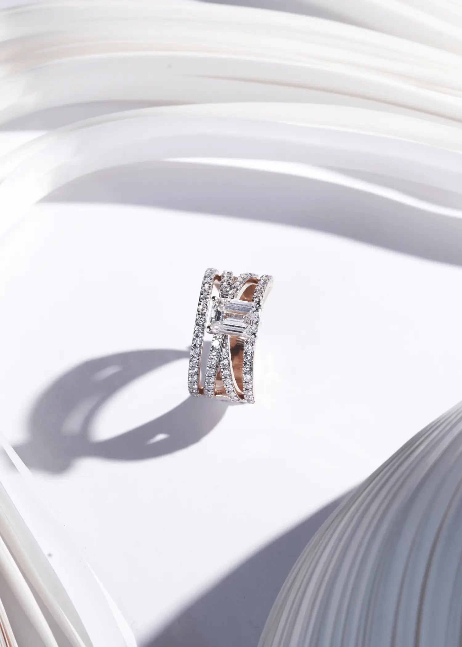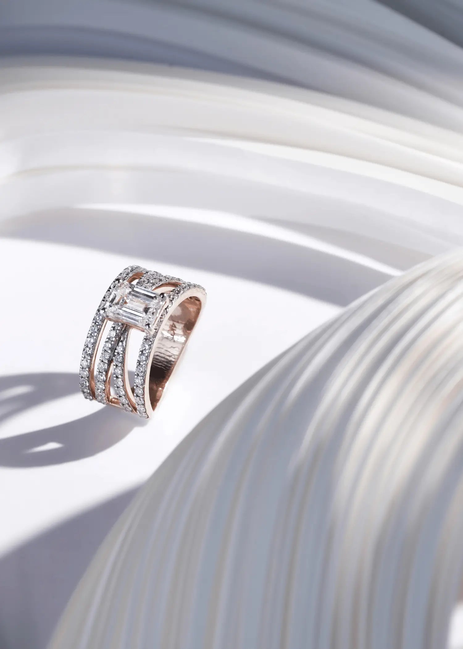 Crafted in warm rose gold, this stunning piece features a 1.87 ct lab-grown emerald-cut diamond center. Three pavé bands cradle the main stone, bringing the total diamond weight to 3.03 ct. This ethically-made ring offers accessible luxury with a regal touch. Perfect for engagements or as a bold statement piece, the Blush Royale combines timeless elegance with modern values.